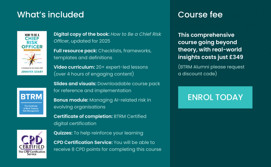 The Certificate of Bank Treasury Risk Management (BTRM) is delighted to announce that we are formally certifying the How to be a Chief Risk Officer course. This collaboration reflects our ongoing commitment to promoting excellence in risk education and professional development within the financial services industry. By certifying this course, the BTRM affirms its quality, relevance, and alignment with the standards expected of senior risk professionals preparing for the vital role of Chief Risk Officer.